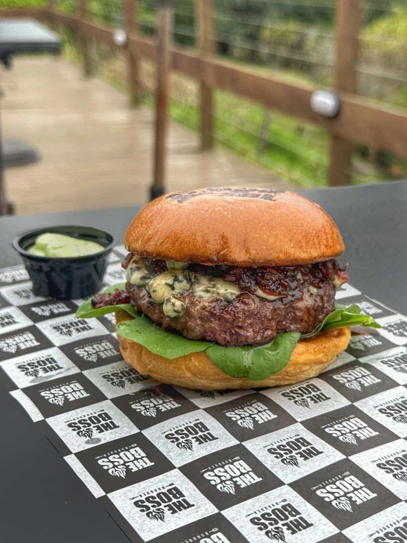 Pão brioche, carne de costela 200g, queijo gorgonzola, geleia de bacon, rúcula e maionese caseira do Boss.