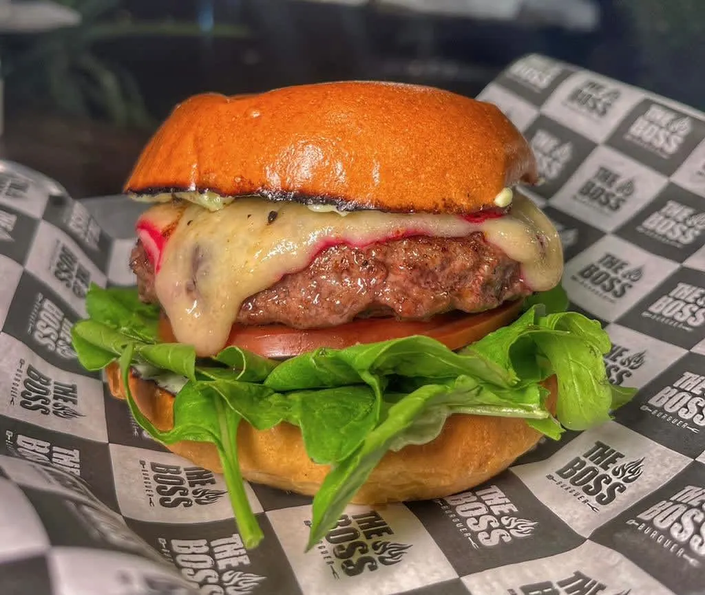 Pão brioche, carne de costela 200g, queijo gouda, rúcula, tomate, cebola roxa e maionese caseira do Boss.